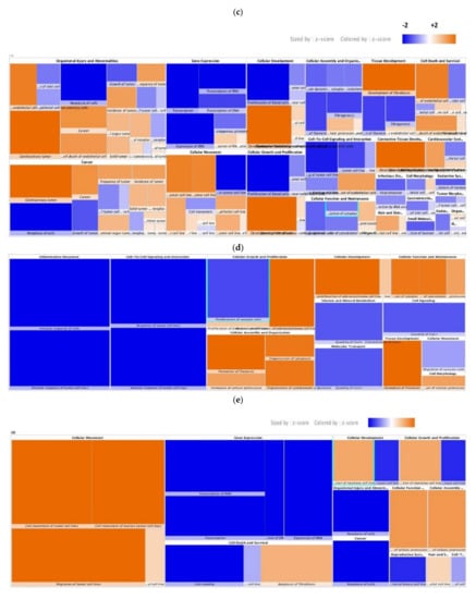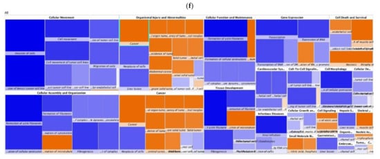 Using the “Diseases and Functions” tab, a bar graph and a categorically organized heatmap were generated to investigate groups of ontologically related diseases and biofunctions predicted to be increased (orange) or decreased (blue) in control and GC groups (Figure 4). We found that cancer, gastrointestinal diseases, and organismal injury and abnormalities were the three diseases or disorders most affected in the GC group (Figure 4a). The least affected diseases and disorders, including neurological disease, dermatological disease and conditions, endocrine system disorders, etc., are shown in Figure 4a. The heatmap-based activation Z-score algorithm of IPA showed that diseases such as cancer, organismal injury and abnormalities, gene expression, cell death, and survival were significantly inhibited compared to the GC group (Figure 4b). In the GC group, disease categories such as cancer, incidence of cancer, and neoplasia were significantly activated based on the Z-score (Figure 4c). The disease and biofunctions activated by the CNVs unique to the control group included cellular development, cellular maintenance, cellular assembly and organization, cell morphology, and tissue development (Figure 4d). The diseases and biofunctions that were significantly activated by the CNVs common in the control and GC groups included cell development, cell movement, cell growth and development, cellular function, and cellular assembly (Figure 4e). The diseases and biofunctions significantly affected by the CNVs unique to the GC group included cancer, solid tumor, abdominal cancer, cell death, and survival (Figure 4f). The diseases and biofunctions affected by CNVs in the control and GC patients are provided in Supplementary Figures S2–S6 and Supplementary Tables S4–S10.
