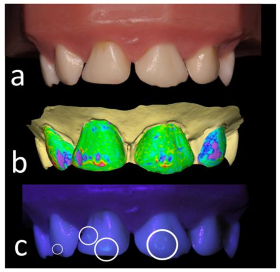 Representative model (a) illuminated by the conventional illumination (b) with visualized surface changes in the OraCheck software (c), illuminated by the fluorescence-inducing light source.