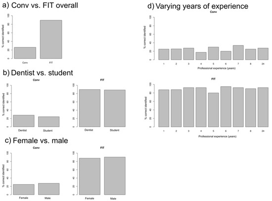 Relative frequencies of correctness of identification (COI) grade 1 (“correct”) for (a) CONV vs. FIT overall, (b) dentists vs. students for CONV and FIT, (c) female vs. male examiners for CONV and FIT, and (d) years of dental experience for FIT and CONV.