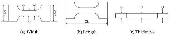 The five printing parameters affecting the dimensional accuracy, carbon dioxide emissions, and three printing costs are summarized by the literature review in Section 1, and they are the fan rate, printing speed, nozzle temperature, build plate temperature, and layer thickness. The printing parameter was considered due to the capability of the printing machine and the material properties of the filament. In addition, it is understood from experience that during the printing process using PLA material, the cooling fan must be turned on to avoid the situation of printing failure. Therefore, the fan rate is set to 50% and 100%. The range of the printing parameters is shown in Table 1. The 3D printer used in this study is the delta-type ATOM 2.5 EX [25], and the filament material is poly lactic acid (PLA) [26], which is environmentally friendly and easy to obtain. The printed object follows the ASTM-1708 standards [27], as shown in Figure 1. During the printing process, the object was placed at the center of the build plate without the need for any support materials. After printing, the outer width (OW), inner width (W), outer length (OL), and thickness (T) of every object were measured to determine the dimensional accuracy, as shown in Figure 2. The size was measured using Mahr’s dial calipers [28], and an average of three values was used for recording.