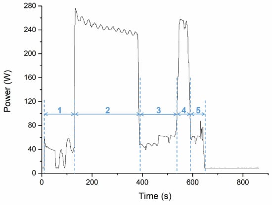 The energy consumption of the printer during a printing cycle was recorded by a smart plug (TP-Link, HS100) [29]. The energy consumption data were updated every two seconds and then recorded in an Excel sheet. Therefore, the total energy consumption could be calculated from the time sequence. The printing cycle was divided into five stages, as shown in Figure 3. Stage 1 involves heating the nozzle temperature to the set value and completing the incoming line procedure. Stage 2 aims at heating the build plate to the set temperature and maintaining the set temperature of the nozzle, and Stage 3 aims at printing the object. In Stage 4, the decline procedure is performed after printing, and the main step is heating the nozzle. In Stage 5, the filament is extracted, and the nozzle module returns to its original position. Carbon dioxide equivalent (CO2e) is the standard unit for measuring CO2 emissions. The concept is to use the same unit to express the degree of influence of different greenhouse gases (GHGs) on global warming. Thus, GHG sources with different CO2 emissions could all be expressed using a single unit. The CO2e of electricity production for Taiwan in the year 2021 was 0.502 kg CO2e/degree. Therefore, the CO2 emission during a printing cycle can be obtained using Equation (1).
