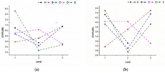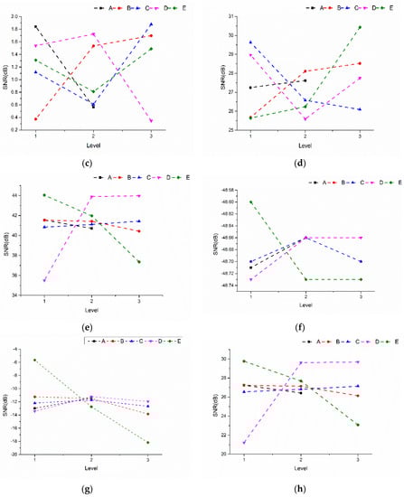 To choose appropriate factors and characterize their impacts, eight single-objective properties were investigated in terms of the signal-to-noise ratio (SNR). The SNR characteristics of these eight single objects (the lower the SNR, the better the performance characteristics) were calculated using Equations (5) and (6), and the SNR could be obtained using the mean and standard deviations. The significance of the factors on all targets was then presented using the main effects plot. Finally, the contribution ratio of each factor could be obtained from the analysis of variance (ANOVA). ANOVA was used to interpret a series of experimental results to assess the significance of individual factors. The sum of squares and percentage contribution of each factor were denoted as SSj and Pj, respectively, and their values could be obtained using Equations (6) and (7), respectively. In Equations (7) and (8), j is the individual parameter, and the total sum of squares is the SNR minus the correction factor.