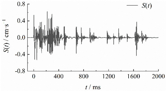 We also conducted several single-shot tests. Each hole contained 1.0 kg of explosives. The blast hole initiation conditions were the same as those of the first blast hole of the actual blast on site for both single-free surface conditions. The test obtained single-hole vibration data {(tn, g(tn))} as shown in Figure 8. We chose a smooth, full vibration curve among theses to calculate with 4–5 peaks in the major vibration part. The predicted signal S″(t) was obtained by superposing the data according to the identified initiation time sequence (δt1, δt2, …, δt6).