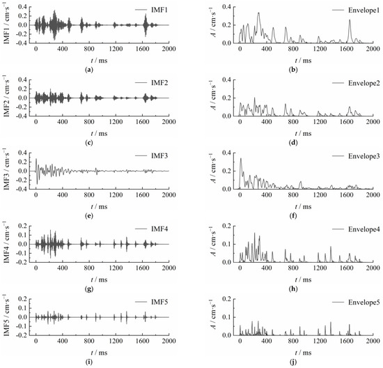 IMF components and envelopes: (a) IMF component 1; (b) Envelope 1; (c) IMF component 2; (d) Envelope 2; (e) IMF component 3; (f) Envelope 3; (g) IMF component 4; (h) Envelope 4; (i) IMF component 5; (j) Envelope 5.