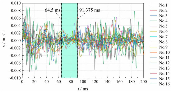 For safety reasons, half of the working face area (1) was detonated first; we charged each cut hole with 1.0 kg to ensure that the blast vibration did not exceed the threshold of 1.0 cm·s−1. Figure 13 shows the actual layout of the blast holes. For the first four delays of the detonators, one delay had one blast hole. For the fifth and sixth delays of the detonators, they all had two holes. Sixteen blasts were executed in one month using this design. We measured the vibration velocity on the ground each time. The maximum vibration velocity was 0.90 cm·s−1, which did not exceed the threshold, as shown in Figure 14. The velocity from 64.5 ms to 91.375 ms was significantly smaller than for the other periods. The operation results showed that the new free surface achieved the expected vibration reduction.