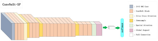 The input size of the model is set as a square image in the design. As shown in Table 1, in the first layer of the model, the images are preprocessed, using convolutional kernels with a step size of 4 and a number of 96, so that the images are scaled down in the scale direction before processing and enriched and expanded with information in the number of channels, and Layer Normalization is performed to accelerate the convergence of training and improve the stability of network fluctuations. Then, the feature map will be fed into the ConvNeXT Block. There are four ConvNeXT Block groups in the whole network structure, where the number of ConvNeXT Blocks in each group is and 3, respectively. A criss cross attention module is set up after the first ConvNeXT Block group to obtain criss cross attention weight feature maps. The second to fourth ConvNeXT Block groups are preceded by a downsample layer to adjust the size and number of channels of the feature map, and a spatial attention module is connected after the last ConvNeXT Block group to collect the attention weights of the feature map in the spatial dimension.After this, we use the global average pooling operator to pool the entire feature layer, making the spatial information of the model more representative, avoiding overfitting in this layer, reducing computational effort, and enhancing robustness to changes in the input space. The last layer is the full connection layer of the model. The full connection dimension changes with the number of categories. Each ConvNext block uses a convolution kernel with a step size of 1 and the number of input channels for deep separable convolution to learn image features while reducing computational effort. The number of channels is then adjusted using two consecutive convolution kernels of step 1. The first convolution kernel adjusts the number of feature map channels to four times the number of input channels, and the second convolution kernel adjusts the number of feature map channels to the number of input channels. The convolution is followed by Layer Normalization, and the second convolution is followed by a corrected non-linear activation unit (GELU). The Layer Normalization layer is used to accelerate the convergence of training and increase the stability of network fluctuation. The non-linear activation unit is used to increase the non-linear relationship between each layer of the neural network, so that the prediction parameters can fit the real parameters and improve the precision degree.