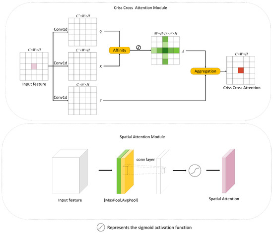 As shown in Figure 2, the first one is the criss cross attention module, which obtains the relationship of each pixel with the surrounding pixel points. The input feature map is passed through a convolution kernel with a step size of 1 to obtain three feature maps—Q, K, and V—where the number of channels of Q, and K is compressed to the number of input channels to reduce the amount of subsequent operations. The Affinity operation is performed on Q, K to obtain the relationship between the pixel points in the feature map Q and the pixel points in the same column of the feature map K peers independent of the channel. Such an operation is performed for each position in Q, i.e., a new feature map of size , denoted as D, can be obtained.The softmax operation is performed on D to make the contribution of each position more explicit, and the feature map is obtained as A. The interrelationship between positions has been obtained after the operation as above.