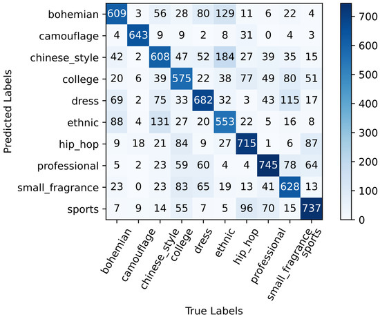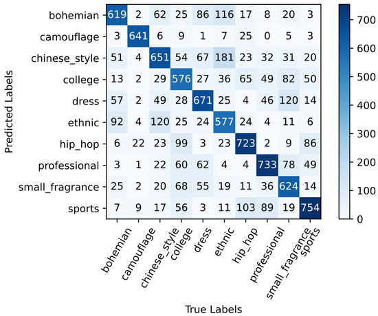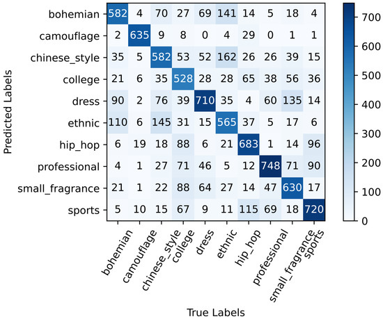 Finally, with the help of the model that trained 50 rounds on the DeepFashion data set, we used transfer learning to make the ConvNeXt-Tiny network with dual attention train 50 rounds on the Style10 data set. Finally, the accuracy rate of the verification set is 69.66%, and the network’s ability to identify clothing style has been greatly improved. The effect of the confusion matrix validated on the test set for the ConvNeXt-Tiny network with dual attention performing transfer learning is shown in Figure 6, and it can be seen that the training of the model has a good convergence effect.