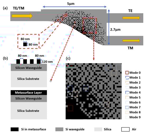 - Ma, H.; Huang, J.; Zhang, K.; Yang, J. Ultra-compact and efficient 1 × 2 mode converters based on rotatable direct-binary-search algorithm. Opt. Express 2020, 28, 17010–17019. [Google Scholar] [CrossRef] [PubMed]