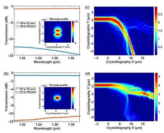 - Shen, B.; Wang, P.; Polson, R.; Menon, R. An integrated-nanophotonics polarization beamsplitter with 2.4 × 2.4 μm2 footprint. Nat. Photonics 2015, 9, 378–382. [Google Scholar] [CrossRef]