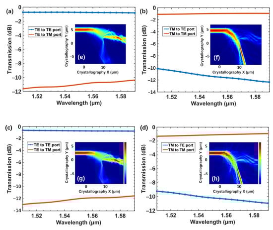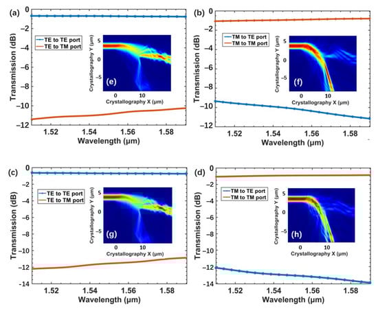 - Huang, J.; Yang, J.; Chen, D.; He, X.; Han, Y.; Zhang, J.; Zhang, Z. Ultra-compact broadband polarization beam splitter with strong expansibility. Photonics Res. 2018, 6, 574. [Google Scholar] [CrossRef]