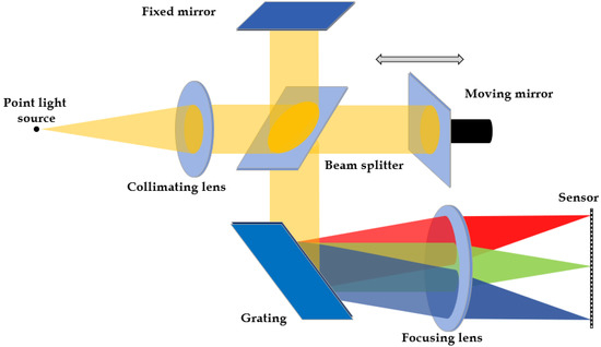 According to the analysis in Section 2, it can be observed that to fully exploit the advantages of bandpass sampling theory and reduce the number of interferogram sampling points, it is first necessary to subdivide the broadband spectrum into narrowband spectra. According to spectral imaging theory, a grating is an effective element capable of subdividing a broadband spectrum into a continuous narrowband spectrum. If a plane reflection grating (or a transmission grating) is set in the outgoing optical path of a Michelson interferometer, then the parallel interfering beam from the outgoing optical path of the interferometer will be diffracted by the grating after entering the plane reflection grating, forming a continuous monochromatic interfering beam arranged by wavelength, after which it will enter the focusing lens and finally interfere at the image plane. If a line array sensor is used, then a continuous narrowband interferogram can be obtained. The basic schematic is shown in Figure 1.