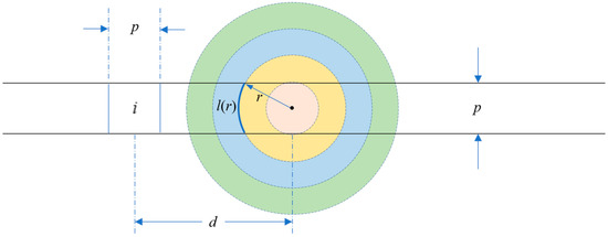 For light with wavelength λ, the distribution of its diffraction pattern at the image plane is shown in Figure 5. Taking the center of the Airy disk as the center of the circle, given any , the diffraction pattern intensity value at is . Then, within the upper and lower boundaries determined by the sensor pixels in Figure 5, the corresponding energy is given by the line integral to the diffraction pattern light intensity over the arc segment ; that is:
