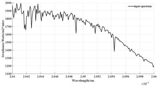 Assuming that the number of pixels along the grating dispersion direction of the line array sensor is and the corresponding pixel size is , then the sensor length along the grating dispersion direction is . Let the spectrum detected by the system be and its effective band range be . The corresponding effective wavenumber range is , where , . Ideally, we typically consider the grating dispersion to be linear, and the wavelength of the dispersion spectrum is uniformly distributed on the sensor image plane. As the sensor is rectangularly sampled, it will divide the broadband spectral signal into segments of discrete narrowband spectral signals at equal wavelength intervals, and for the th pixel, the wavelength of the narrowband spectral signal covered is shown in Equation (6):