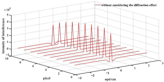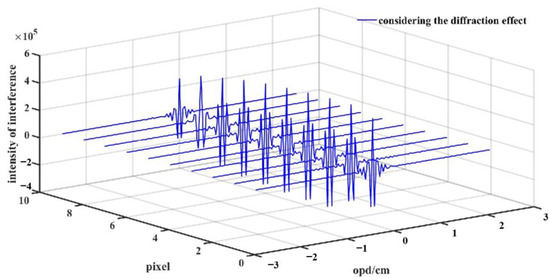 The interference data obtained using our simulation are arranged by pixel, as shown in Figure 8 and Figure 9. Figure 8 represents the sampled interferogram corresponding to the case without considering the diffraction effect, and Figure 9 represents the sampled interferogram corresponding to the case considering the diffraction effect. Figure 10 shows the interferogram of the spectrum corresponding to the fifth pixel. It can be observed that the interferogram sampling step after considering the diffraction effect is smaller, with more sampling points and richer details.