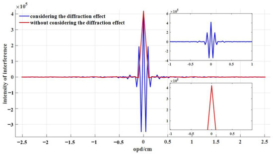 Combining Equations (11), (14) and (15), we can obtain wavelengths and , corresponding to the black and red curves, and all spectra in this wavelength range contribute to the energy of the th pixel. The wavenumber range corresponding to this wavelength range is , where , . Obviously, this spectral range is larger than that expressed in Equation (6), which is mainly due to the optical diffraction effect. Next, we analyze the influence of the diffraction effect on the bandpass sampling interferogram and recovered spectrum.