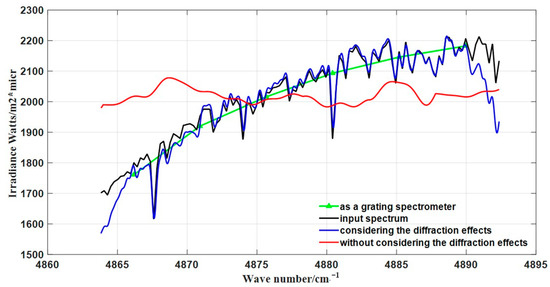 We took the recovered spectra of the middle six pixels in both cases and normalized them with the input spectrogram; the comparison is shown in Figure 13. The black line in Figure 13 represents the real input spectrum after considering the diffraction effect, the red line represents the recovered spectrum without considering the diffraction effect, the blue line represents the recovered spectrum after considering the diffraction effect, and the green line represents the curve of the normalized energy collected by each pixel when the system is stationary with 0 optical path difference, such as for a grating spectrometer. It can be observed that if the diffraction effect is not considered, the recovered spectral curve will undergo serious aliasing; hence, only a lower spectral resolution can be achieved. In the case where the diffraction effect is considered, the recovered spectrum is fundamentally the same as the input spectral curve with more obvious details. This is also consistent with our theoretical analysis in Section 4, and the green marker line trend is also consistent with the spectrum trend.