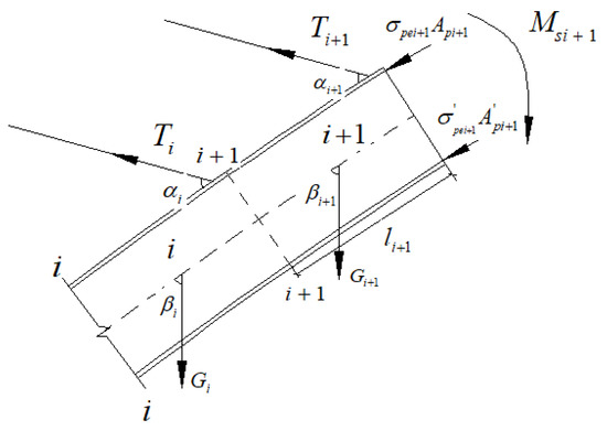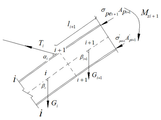 where is the axial pressure of the section i of the arch ring, is the bending moment of the section i of the arch ring, is the temporary bending moment load at the section i, generally considered as hanging basket and formwork load, is the self-weight load of the segment i, is the distance from the center of gravity of the net section to the point of the combined force of prestressing and normal reinforcement in the body, is the stress at the top flange of the arch ring of section i of segment i, is the stress at the bottom flange of the arch ring of section i of segment i, is the angle from the position of the j-th buckle cable and buckle point to the straight line of the shaped center point of the calculated section, is the angle from the position of the center of gravity point of segment j to the straight line of the shaped center point of the calculated section to the vertical direction, and is the length of segment j, l is the length of the segment, h is the height of the section.