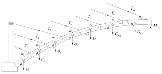 The stress calculation of the top and bottom flanges of the arch ring section for the two sections can be extended to the stress calculation of the top and bottom flanges of the arch ring section for any section under any construction stage. The structural calculation model is shown in Figure 4. The analysis of the prestressing tensioning condition of any arch section and the coupling action of the cable force and prestressing force after tensioning of the buckled cable can derive the formula of the stress on the top and bottom flanges of the section of any arch section.