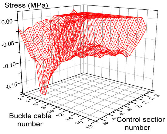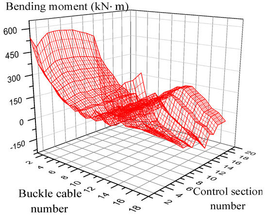Given a large amount of data, the surfaces of the influence of the buckle force on the stress and the bending moment of the arch ring are shown in Figure 5 and Figure 6.