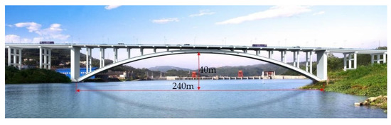 Reinforced concrete arch bridges are highly respected in the construction of mountain bridges because of their good force performance and low post-maintenance costs [1,2,3], and the site-specific diagonal buckle cantilever casting construction method has increasingly become the mainstream of construction methods for large-span reinforced concrete arch bridges [4,5,6,7,8,9]. The first cantilever-cast reinforced concrete arch bridge was the 246 m main span Sibenik Bridge, which was completed in Croatia (former Yugoslavia) in 1966. Several world-record reinforced concrete arch bridges have been built abroad using this construction method, which also makes cantilever-cast reinforced concrete arch bridges widely promoted and applied, and the world’s largest cantilever-cast reinforced concrete arch bridge with a main span of 384 m is the Almonte railroad bridge completed in 2016 [5]. The cantilever casting method for reinforced concrete arch bridges was applied in China at a late stage. The first reinforced concrete arch bridge constructed by cantilever casting method in China was the 150 m main span of Baishaigou No. 1 bridge built in 2007 on the Xichang-Panzhihua highway in Sichuan [10]. So far, China has used the cantilever casting method to build the Mupeng Bridge (completed in 2013, the main span of 165 m), the Xinmidi Bridge (completed in 2013, the main span of 182 m), the Horseshoe River Bridge (completed in 2015, the main span of 180 m), Ganyu Bridge (completed in 2015, the main span of 200 m), Shatuo Bridge (completed in 2019, the main span of 240 m), Jieming Three Provinces Bridge (completed in 2020, the main span of 180 m) and other seven reinforced concrete arch bridge [11,12,13]. Among them, Shatuo Bridge is the largest span cantilever cast reinforced concrete arch bridge completed in China. At present, the largest span of cantilever cast reinforced concrete in China is the main span of the Shuiluo River Bridge with 335 m under construction in Gulin County, Sichuan Province. The typical cantilever cast reinforced concrete arch bridges of more than 200 m at home and abroad are summarized in Table 1.