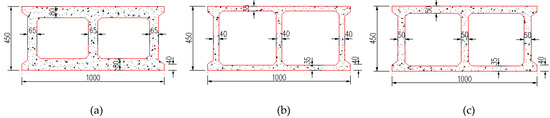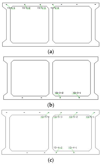 Schematic diagram of the arrangement of prestressing beams in the section of the arch ring: (a) Single top slab with prestressing tendons, A-A cross-section, (b) Single bottom slab with prestressing tendons, B-B cross-section, (c) Top and bottom slabs with prestressing tendons at the same time, C-C cross-section.