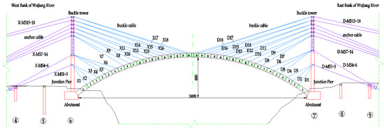 Shatuo Bridge is located in Yanhe County, Guizhou Province, and is a reinforced concrete arch bridge across the Wu River, whose arch ring is built with a skewed buckle cantilever casting process. The main arch of the bridge is a reinforced concrete box structure with equal height cantilever lines, with a net span diameter of 240 m, a net vector height of 40 m, a net vector-to-span ratio of and an arch axis coefficient of . The span layout of the main bridge is shown in Figure 8. The arch ring section is a single box double chamber structure, box width of 10 m, height of 4.5 m. The thickness of top and bottom of the arch rib section is both 80 cm, and the thickness of three webs is all 65 cm, as shown in Figure 9a. In the L/4 section of the arch rib, the thickness of the top and bottom of the arch rib section is both 35 cm, and the thickness of three webs is all 40 cm, as shown in Figure 9b. In the L/2 section of the arch rib, the thickness of top and bottom of the arch rib section is 50 cm and 35 cm, respectively, and the thickness of three webs is all 50 cm, as shown in Figure 9c. The longitudinal section of the arch ring is divided into 37 sections, among which section No.1 at the position of the arch foot on both banks is a bracket cast-in-place section, a hanger cast-in-place section is set at the top of the arch, and the remaining 34 sections are cantilever cast-in-place sections with diagonal pulling buckle hanging baskets. After the arch ring sections are cast and reach the design strength, they are anchored on the junction pier or buckle tower with buckle cables, and the longitudinal deflection of the junction pier and buckle tower is adjusted with the anchor cables to control the structural deformation. Construction layout of the buckled anchor cable of Shatuo Bridge is shown in Figure 10.