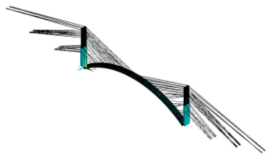 Ansys/APDL is used to build the finite element parametric model of the whole bridge, in which the main arch ring is modeled by SOLID65 3D beam unit; considering that the optimization model needs to be solved iteratively at a later stage, LINK10 nonlinear rod unit is used for the buckle cable, and the modulus of elasticity of the buckle cable is modified based on Ernst’s formula to account for the geometric nonlinear effect; the restraint between the buckle cable and the main arch ring is achieved by MPC184 unit (activated rigid beam characteristic); the arch footing end face is solidified by face restraint and the node joint degrees of freedom between arch ring i and i + 1 segments. The buckle tension is applied by applying real constants (initial strain), and the “cell life and death” function is introduced to simulate the construction process of cantilever casting of the arch ring. To simplify the calculation process and improve the calculation efficiency, the constraint equations are established between the concrete unit nodes and the force reinforcement unit nodes by the “ceintf” command. The “ceintf” command automatically selects several nodes of the concrete unit and establishes the constraint equation with one node of the force reinforcement within the tolerance range and connects the force reinforcement unit and concrete unit as a whole through multiple sets of constraint equations. Ignoring the prestressing loss case, the prestressing design parameters are completed by setting the array about the area function. The specific finite element model is shown in Figure 11. The prestressing beam distribution is shown in Figure 12, Figure 13 and Figure 14.