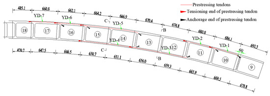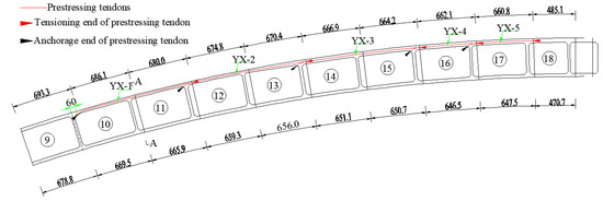 Schematic diagram of the overall elevation of the prestressing tendons on the east bank.