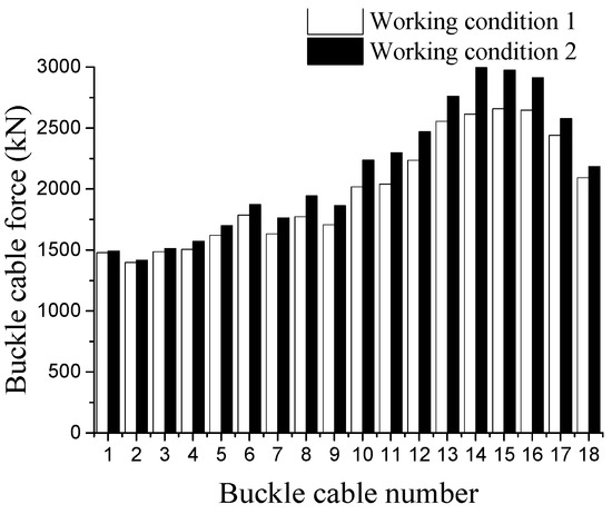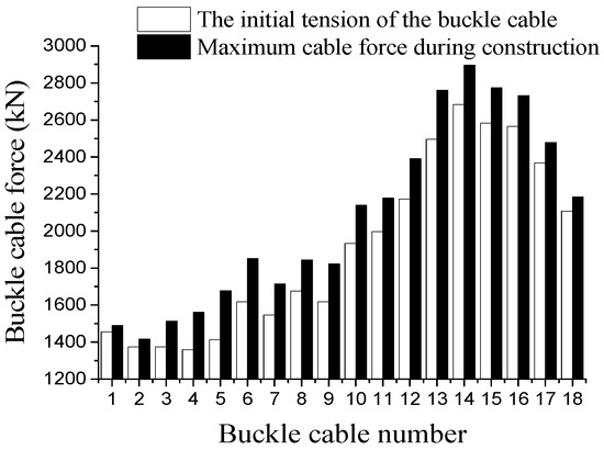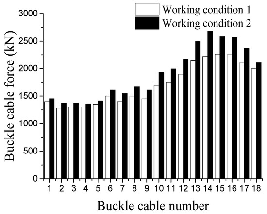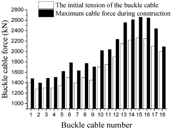 In the presence of the temporary prestressing effect (hereinafter referred to as working condition 2), the initial tension of each buckle cable during cantilever casting and the maximum cable force during construction were extracted and compared with the results without the configuration of prestressing tendons (hereinafter referred to as working condition 1). The comparison after the convergence of the objective function iteration is summarized in Figure 15, Figure 16, Figure 17 and Figure 18, which is based on the West Coast buckle cable force.