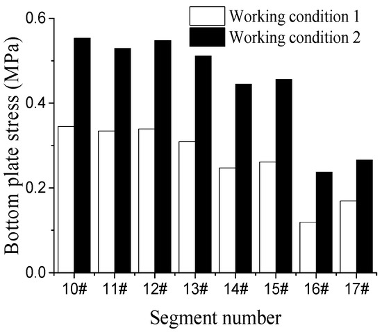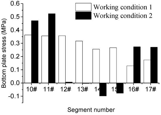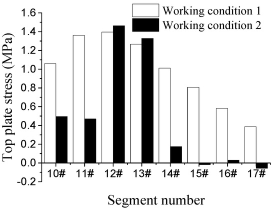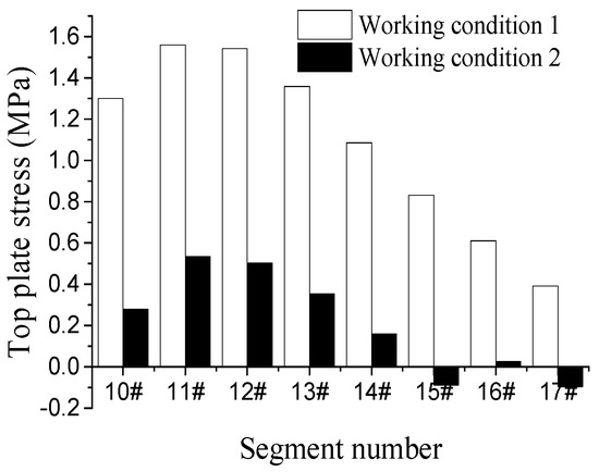 Under the joint action of buckle force and temporary prestressing force (hereinafter referred to as working condition 2), the maximum tensile stress results of each section of the top and bottom slab of the main arch ring in the process of cantilever pouring were extracted and analyzed, and compared with the stress results of each section of the main arch ring in each section from 10# to 17# without the configuration of prestressing tendons (hereinafter referred to as working condition 1), and the comparison of the specific results under the two working conditions is shown in Figure 19, Figure 20, Figure 21 and Figure 22. In the resultant data, negative stresses indicate compressive stresses and positive stresses indicate tensile stresses.
