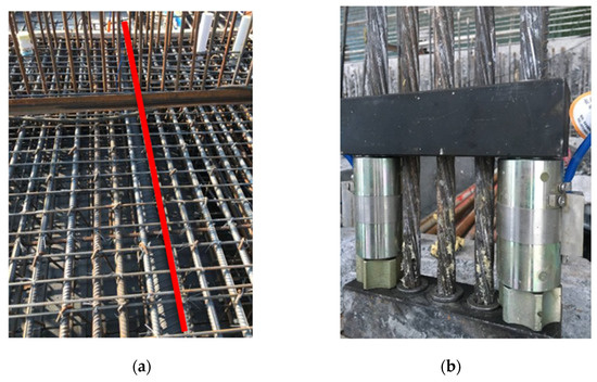 Site layout of temporary prestressing tendons: (a) Site drawing of a longitudinal arrangement of prestressing tendons; (b) Site drawing of prestressing tendon section layout.
