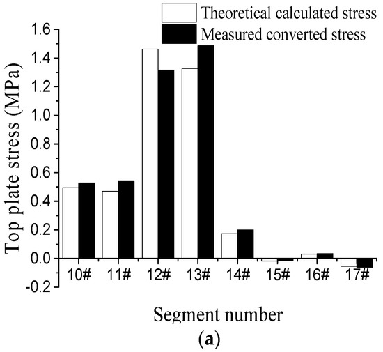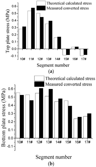 Comparison of theoretical calculation and measured conversion stress of the arch ring section in the west bank: (a) Arch ring top flange, (b) Arch ring bottom flange.