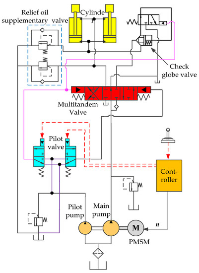 - Lin, T.; Lin, Y.; Ren, H.; Chen, H.; Li, Z.; Chen, Q. A double variable control load sensing system for electric hydraulic excavator. Energy 2021, 223, 119999. [Google Scholar] [CrossRef]