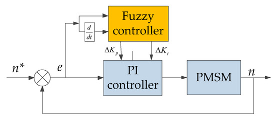In this paper, there are two inputs of the fuzzy controller. One is the difference between the target speed and the actual speed of the electric motor, and the other one is the change in the difference. The output is the change in the PI parameters, they are and . It can be concluded that the structure of the online tuning regulator for speed PI parameters of PMSM vector control system is shown in Figure 7. The final expression of the speed PI parameter online tuning regulator is: