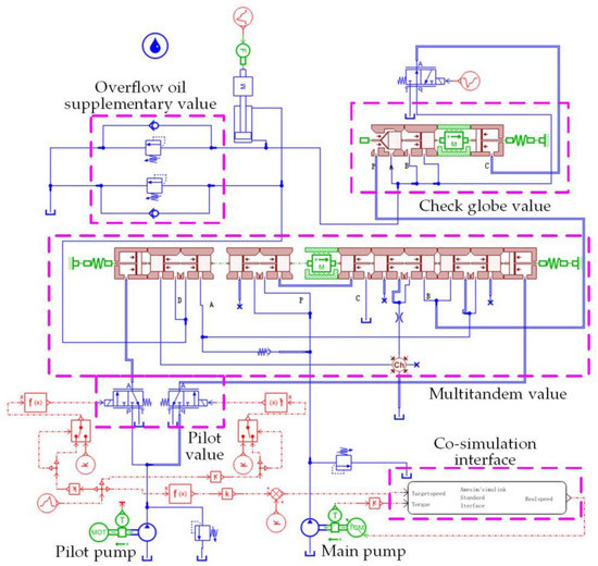 The co-simulation model is shown in Figure 8. The simulation model includes the main pump, the pilot pump, the pilot valve, the multi-way valve, the check globe valve, relief oil supplementary valve, the actuator, the co-simulation interface, etc. The regulator for online tuning of speed PI parameter is designed with a fuzzy PI controller. The controller mainly includes a fuzzy logic controller, a proportional loop, an integral loop, and a speed limiting module.