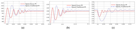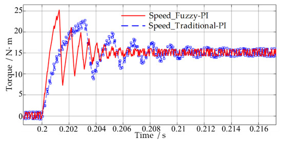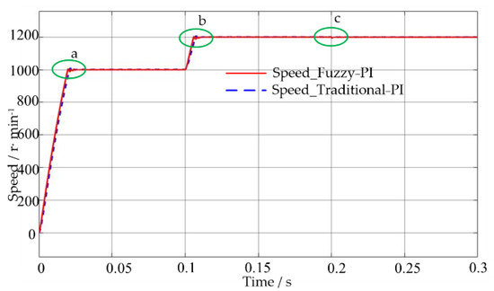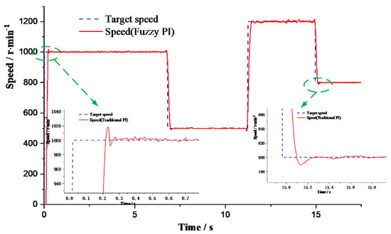 The speed responses of the two speed control methods are shown in Figure 9 and Figure 10. When the electric motor starts, the overshoot of the traditional PI control and fuzzy PI control are 12 r/min and 6 r/min, respectively. The time to steady state is 40 ms and 31 ms, respectively. When the speed changed suddenly, the overshoot of the traditional PI control and fuzzy PI control are 8 r/min and 5 r/min, respectively. The time to steady state is 24 ms and 16 ms, respectively. A 15 N·m load is added at 0.2 s, the electric motor speed drop of the traditional PI control and fuzzy PI control are 10 r/min and 6 r/min, respectively. Moreover, the adjustment time is 16 ms and 7 ms, respectively. Therefore, when the fuzzy PI control is used, the motor speed output overshoot is smaller, the response is faster, the load disturbance has less affection, and the stability is higher.