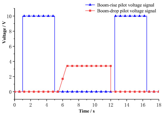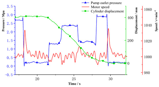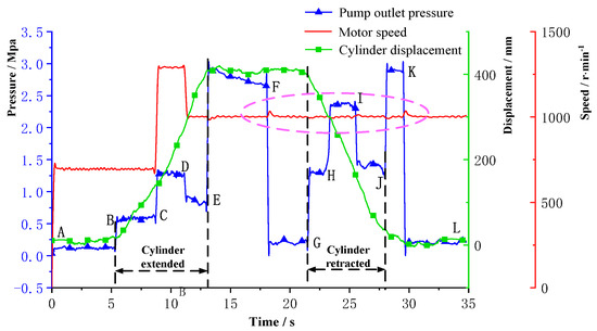To verify the performance of the designed controller, the variable speed, constant speed, loading and unloading tests are carried out during the cylinder extension and retraction process, shown in Figure 29. The AB and JL are the static stages of the cylinder, the pump outlet pressure is about 0 MPa, and the cylinder displacement is about 0 mm. At the time of B, the directional control valve is switched to the left position, the cylinder begins to extend without load. The target speed of the BC section is 700 r/min, and the pump outlet pressure is about 0.5 MPa. At the time of C, the electric motor speed changes to 1280 r/min. At this time, the pump outlet flow becomes larger, and the operating speed of the cylinder becomes larger too. The slope of the displacement curve corresponding to the CD segment becomes larger than that of the BC segment. At the time of D, the electric motor speed changes to 1000 r/min. At the time of E, the cylinder moves to the maximum stroke, until the directional control valve is switched to the right position at time G when the cylinder starts to retract. The EF section indicates that the cylinder is at the maximum stroke, the pump outlet hydraulic oil overflows through the main relief valve to the oil tank, and the pump outlet pressure is the relief valve which pressure is 2.7 MPa. The FG section is the directional control valve working in the neutral position. Pump outlet oil directly flows back to the oil tank through the check valve, and the pressure is close to 0 MPa. At the time of H, the relief valve on the side of the rodless cavity is adopted to load, the pump outlet pressure changes from 1.4 MPa to 2.4 MPa. At the time of I, the relief valve is unloaded, the cylinder is retracted without load, and the pump outlet pressure returns to 1.4 MPa. At the time of J, the cylinder is retracted to the minimum stroke, the pump outlet oil overflows from the main relief valve back to the tank. At this time the pump outlet pressure is the relief valve pressure which is 2.7 MPa.