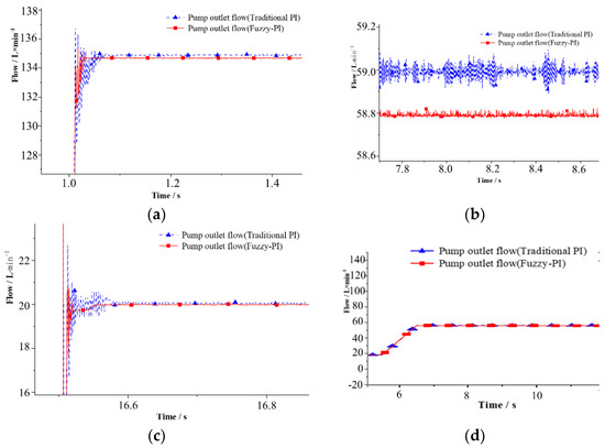 The partial magnification curve of pump outlet flow. (a) Flow step rise; (b) flow stability; (c) flow step drop; (d) flow ramp response.