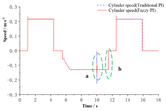 Figure 16 is the cylinder speed curves and Figure 17 is the partial amplification curve of the cylinder speed. It can be seen from the partial amplification curve of the cylinder speed during shoveling that when the load is loaded during work, the cylinder speed fluctuates greatly, with large spikes and obvious jitter under the traditional PI control. While, under fuzzy PI control, the cylinder speed only fluctuates slightly, and the adjustment time is shorter. When the speed of the cylinder changes step by step, the cylinder speed has a large overshoot, the adjustment time is longer and the oscillation is obvious under the traditional PI control. While under the fuzzy PI control, cylinder speed is less overshoot, the adjustment time is shorter, and there is only a small oscillation. Therefore, when fuzzy PI control is used, the cylinder speed operation has better robustness and stability.