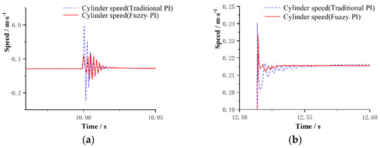 The partial amplification curve of the cylinder speed. (a) During shoveling loading; (b) step change.