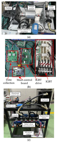 The test rig consists of a power source and the hydraulic system. The power source mainly includes a motor controller, a PMSM, a torque sensor, and a gear pump. The hydraulic system mainly includes a cylinder, a displacement sensor, a pressure sensor, a directional control valve, and two proportional relief valves. The proportional relief valve is used to simulate load. The positive hydraulic system is realized by adjusting the electric motor speed.