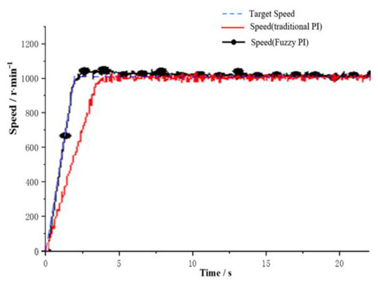 The speed curves of the motor control system under the no-load variable speed based on traditional PI and fuzzy PI when a ramp signal is input are provided in Figure 22. It can be seen that two control methods can follow the target ramp input well. Between of them, the fuzzy PI control method is more ideal, although there is some overshoot. The traditional PI has a slow following response.