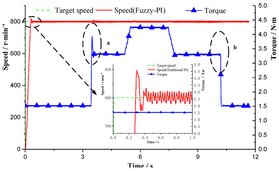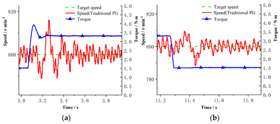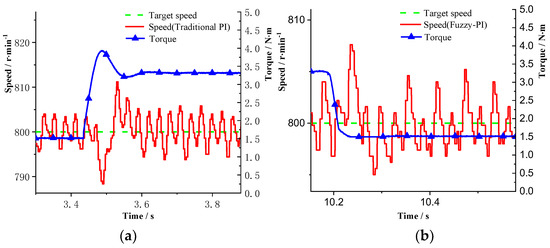 The speed curves of the motor control system under the constant speed loading based on the traditional PI control and the fuzzy PI control are provided in Figure 23, Figure 24, Figure 25 and Figure 26. The test target speed is 800 r/min, and the initial load is 1.5 N·m. When the electric motor starts, the overshoot of the PI control and fuzzy PI control are 38 r/min and 19 r/min, respectively. Moreover, the times to steady state are 600 ms and 420 ms, respectively. Under the traditional PI control, when the load is added to 3.3 N·m at 3 s, the speed jittered, and the fluctuation range is 17 r/min. Then it enters the steady state after 300 ms. Torque is released to 1.5 N·m at 11 s, and the speed jittered with a fluctuation range of 12 r/min. After 140 ms, it enters the steady state again. While under the fuzzy PI control, the load is suddenly added to 3.3 N·m at 3.4 s, and the speed fluctuation range is 12 r/min. Then it enters the steady state after 120 ms. Torque is released to 1.5 N·m at 10 s, and the speed jittered with a fluctuation range of 8 r/min. After 80 ms, it enters the steady state again. It can be seen that during the loading process, when fuzzy PI control is adopted, the speed jitter is smaller and the response is faster. Therefore, the system adopting fuzzy PI control has stronger anti-load disturbance ability, better robustness, and anti-interference performance.