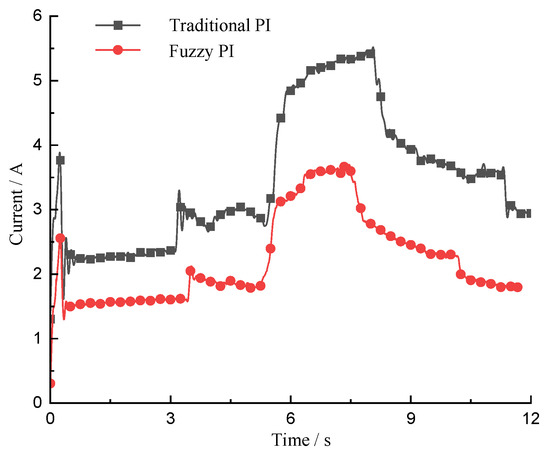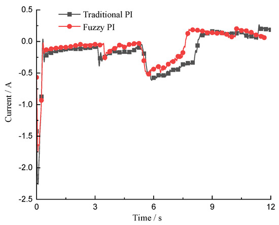 The and curves of the motor control system under the constant speed loading based on the traditional PI control and the fuzzy PI control are provided in Figure 27 and Figure 28, respectively. It can be seen that after loading, the current of quadrature axis and direct axis are smaller when the fuzzy PI control is adopted. After entering the steady state, the current fluctuation is smaller, and the current stability is also better.