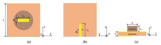 Configuration of the proposed DRA: (a) top view; (b) back view; (c) side view. L = 60 mm; h = 0.8 mm; D = 30.2 mm; hd = 15 mm; Wf = 2.18 mm; WS = 3.5 mm; Lf = 4 mm; Ls = 20 mm.