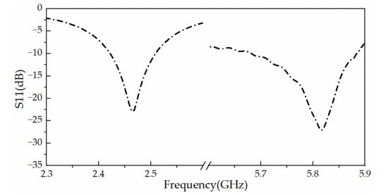 The simulated S11 of the proposed DRA is shown in Figure 2. The measured impedance bandwidths with S11 ≤ −10 dB are 2.41–2.51 GHz and 5.63–5.88 GHz, respectively, for lower and higher bands that fully covers the impedance bandwidth of the 2.45 GHz and 5.8 GHz.