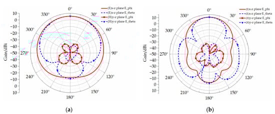 The electric field distributions shown in Figure 3 verify that the proposed DRA resonates at its TEM111 mode at 2.45 GHz, and at 5.8 GHz it resonates at its TEM211 mode. Figure 4 shows the simulated radiation patterns of the proposed DRA at the operating frequency bands. At 2.45 GHz, the cross-polarization of the x-z plane is less than −40 dB, and that of the y-z plane is less than −30 dB. At 5.8 GHz, the cross-polarization of the E plane is also less than −40 dB, and that of the H plane is less than −25 dB. A broad beamwidth can be observed. For 2.45 GHz, the half-power beamwidth (HPBW) is about 120° (E plane) and 90° (H plane). For 5.8 GHz, the HPBW is about 60° (E plane) and 40° (H plane), which can achieve a better performance of energy harvesting.