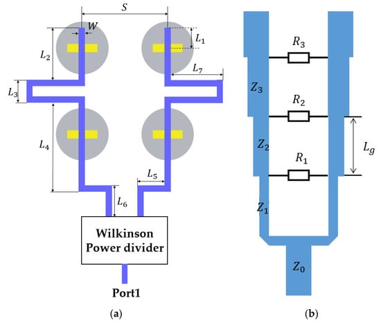 Configuration of the proposed DRA array: (a) Configuration of the feeder line; (b) Configuration of the wilkinson power divider: L1 = 6 mm; L2 = 25 mm; L3 = 8 mm; L4 = 40 mm; L5 = 20 mm; L6 = 10 mm; L7 = 23 mm; Lg = 18 mm; S = 40 mm; W = 2 mm; Z0 = 50 Ω; Z1 = 86.98 Ω; Z2 = 70.71 Ω; Z3 = 57.49 Ω; R1 = 100 Ω; R2 = 197 Ω; R3 = 373 Ω.