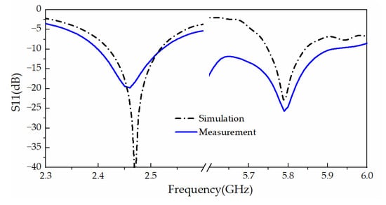 To verify the performance of the DRA array, a prototype is fabricated and measured, as shown in Figure 6. The simulated and measured S11 of the antenna array is shown in Figure 7. The simulated impedance bandwidth with in the lower band is 2.42–2.51 GHz and the measured result is 2.4–2.52 GHz. For the upper band, the simulated bandwidth is 5.74–5.84 GHz, and the measured impedance bandwidth is 5.29–5.91 GHz. It can be observed that a good impedance matching is obtained. The difference between simulated and measured results at upper pass band might be due to the larger machining dimensions and the uneven distribution of dielectric substrate materials.